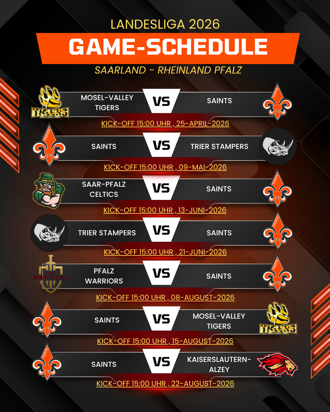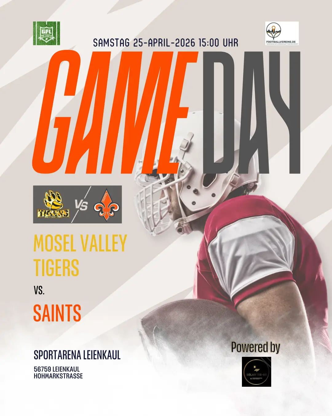 Erlebe echten Football in der Landesliga Saarland/Rheinland-Pfalz! Wir freuen uns auf packende Matchups, fairen Sportsgeist und die unvergleichliche Gameday-Atmosphäre. Unterstützt unser Team von der Tribüne aus und werdet Teil unserer lokalen Football-Community. Hier findet ihr alle Spieltermine auf einen Blick – markiert euch die Daten im Kalender und seid dabei!